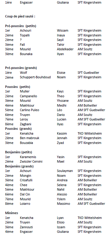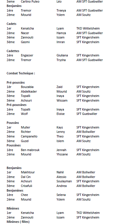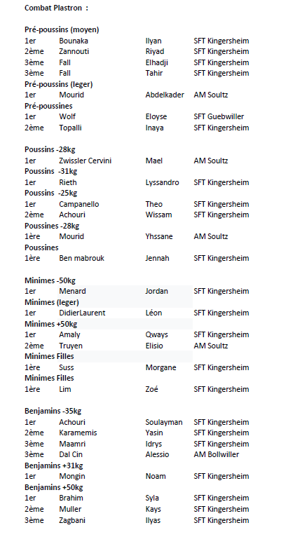 RESULTATS OPEN DU HAUT RHIN ( 22.03.2026 à Soultz) Auteur/autrice de la publication :Raphaël Schmitz Post published:27 mars 2026 Post category:Non classé Vous devriez également aimer Résultats Grand Prix d’Europe combat complet et boxing à Bron 2022 20 janvier 2022 Passage de grade combat boxing 27 juin 2022 IST 1 – Résultats 15 mars 2024