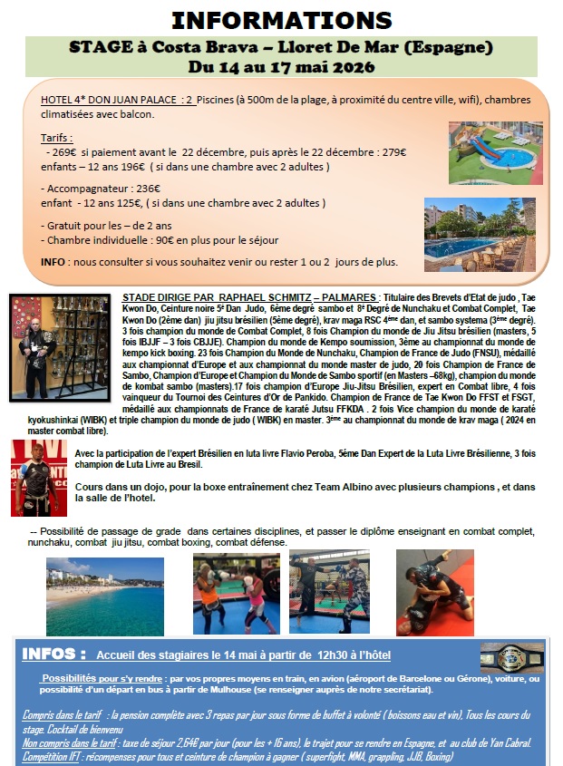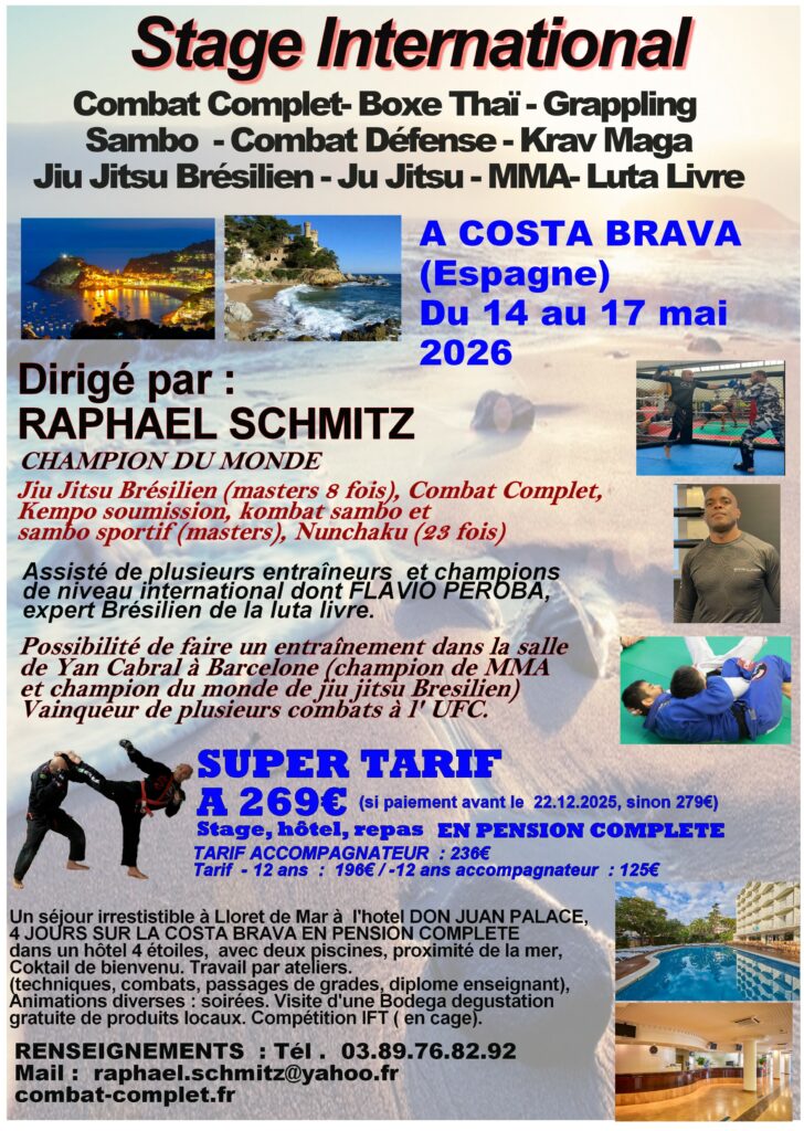 - Du 14 au 17 mai 2026 : Stage international boxe Thaï – jiu jitsu Brésilien – MMA – grappling … à Costa Brava ( Lloret de Mar en Espagne)